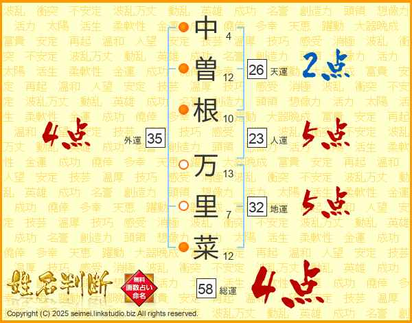 中(4画)曽(12画)根(10画) 万(13画)里(7画)菜(12画)