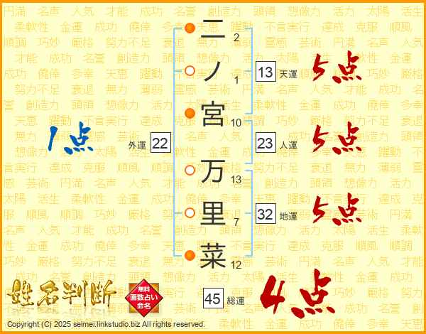 二(2画)ノ(1画)宮(10画) 万(13画)里(7画)菜(12画)