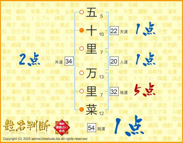生活面を象徴する運勢です。外部から受ける影響力を表し、結婚運、家庭運や職場、環境への順応性を表します。総運から人運を引いた画数。姓や名が1文字の場合を除く。