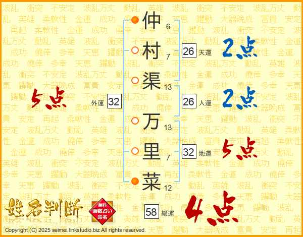 仲(6画)村(7画)渠(13画) 万(13画)里(7画)菜(12画)