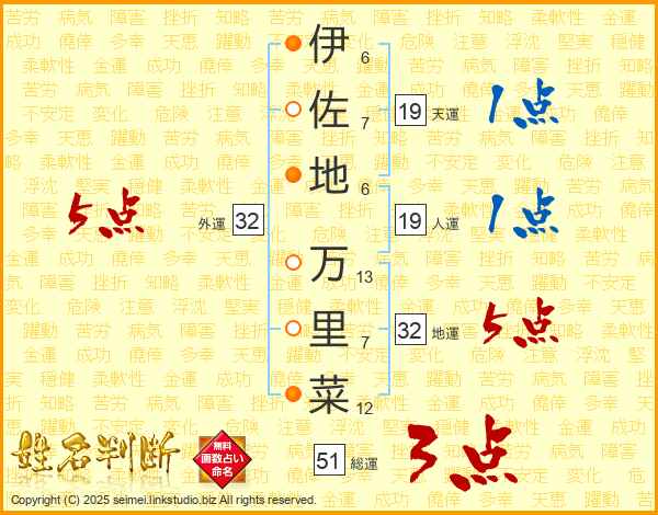 伊(6画)佐(7画)地(6画) 万(13画)里(7画)菜(12画)