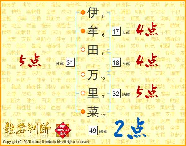 伊(6画)牟(6画)田(5画) 万(13画)里(7画)菜(12画)