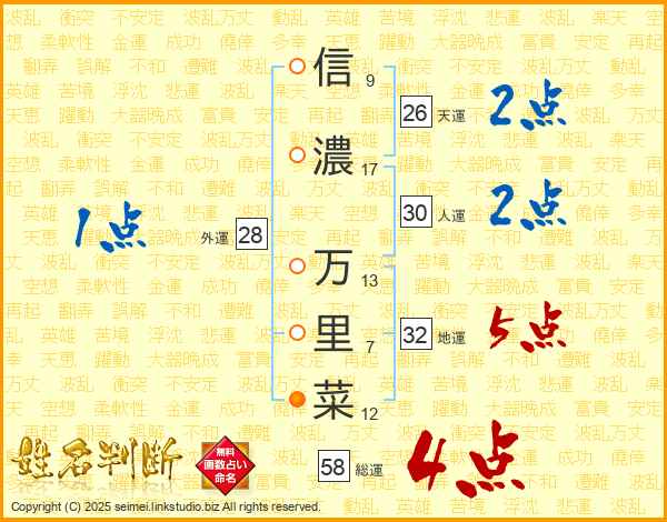 信(9画)濃(17画) 万(13画)里(7画)菜(12画)