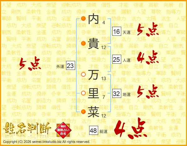 内(4画)貴(12画) 万(13画)里(7画)菜(12画)