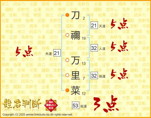 刀(2画)禰(19画) 万(13画)里(7画)菜(12画)
