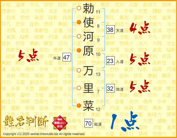 勅(11画)使(8画)河(9画)原(10画) 万(13画)里(7画)菜(12画)