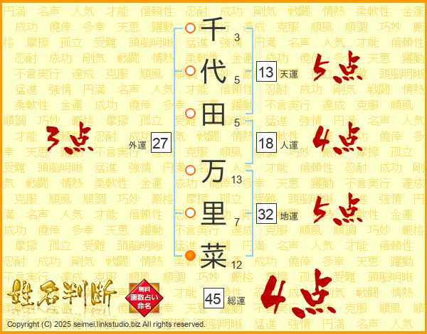 千(3画)代(5画)田(5画) 万(13画)里(7画)菜(12画)