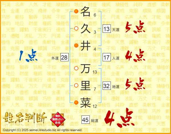 名(6画)久(3画)井(4画) 万(13画)里(7画)菜(12画)
