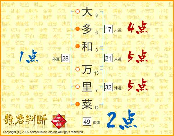 生活面を象徴する運勢です。外部から受ける影響力を表し、結婚運、家庭運や職場、環境への順応性を表します。総運から人運を引いた画数。姓や名が1文字の場合を除く。