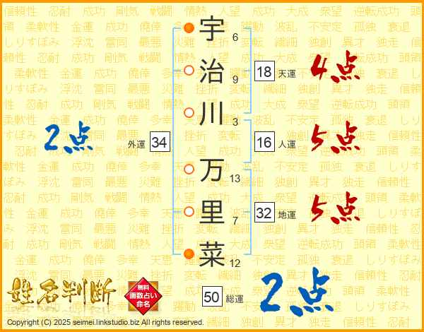 宇(6画)治(9画)川(3画) 万(13画)里(7画)菜(12画)