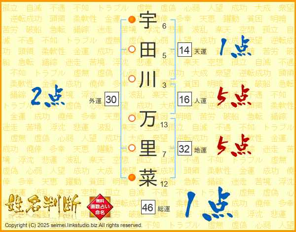 宇(6画)田(5画)川(3画) 万(13画)里(7画)菜(12画)