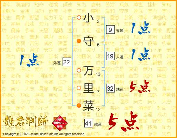 小(3画)守(6画) 万(13画)里(7画)菜(12画)