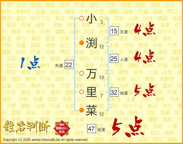 小(3画)渕(12画) 万(13画)里(7画)菜(12画)