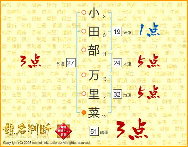 小(3画)田(5画)部(11画) 万(13画)里(7画)菜(12画)