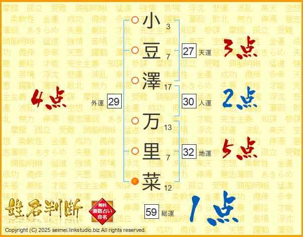 小(3画)豆(7画)澤(17画) 万(13画)里(7画)菜(12画)