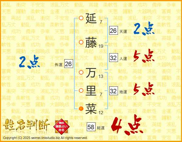 延(7画)藤(19画) 万(13画)里(7画)菜(12画)