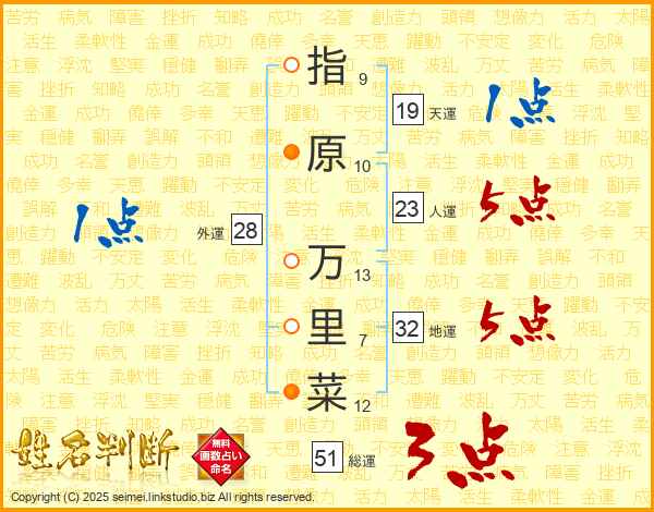 指原万里菜さんの総運は51画の3点!