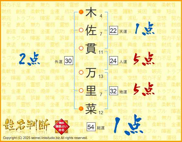 木(4画)佐(7画)貫(11画) 万(13画)里(7画)菜(12画)