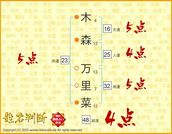 木(4画)森(12画) 万(13画)里(7画)菜(12画)