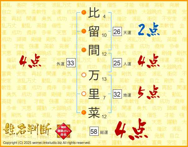 生活面を象徴する運勢です。外部から受ける影響力を表し、結婚運、家庭運や職場、環境への順応性を表します。総運から人運を引いた画数。姓や名が1文字の場合を除く。