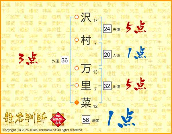 沢(17画)村(7画) 万(13画)里(7画)菜(12画)