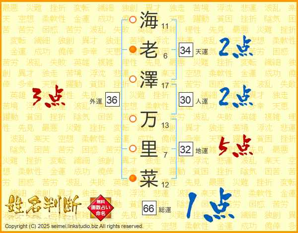 海(11画)老(6画)澤(17画) 万(13画)里(7画)菜(12画)