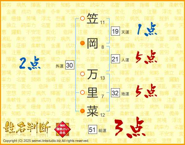 笠岡万里菜さんの総運は51画の3点!