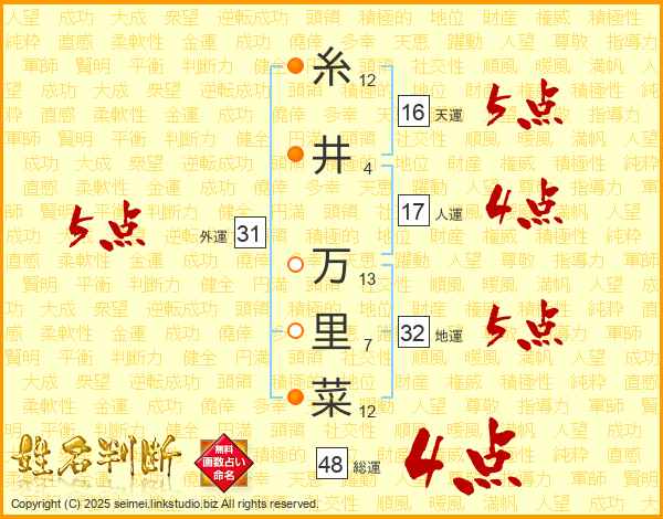 糸(12画)井(4画) 万(13画)里(7画)菜(12画)