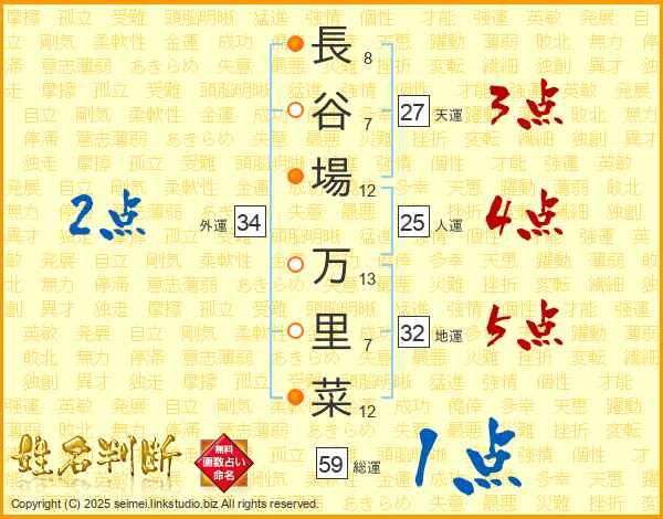 長(8画)谷(7画)場(12画) 万(13画)里(7画)菜(12画)