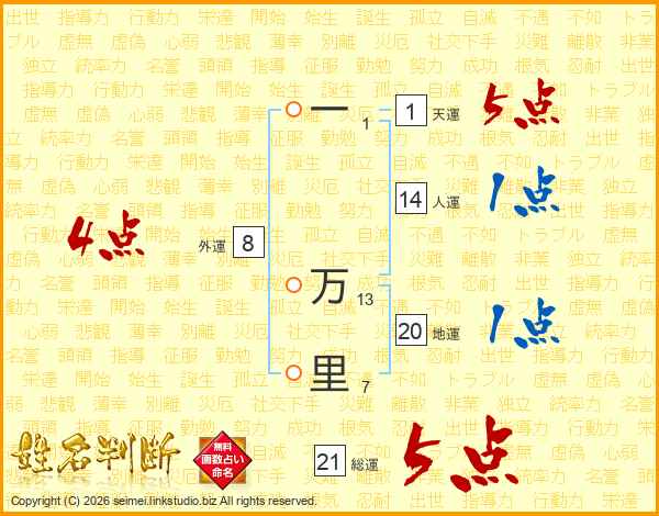生活面を象徴する運勢です。外部から受ける影響力を表し、結婚運、家庭運や職場、環境への順応性を表します。総運から人運を引いた画数。姓や名が1文字の場合を除く。
