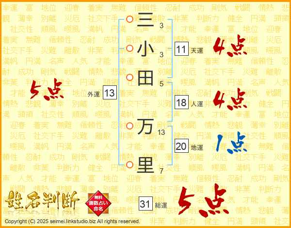 生活面を象徴する運勢です。外部から受ける影響力を表し、結婚運、家庭運や職場、環境への順応性を表します。総運から人運を引いた画数。姓や名が1文字の場合を除く。