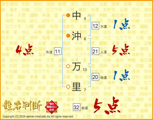生活面を象徴する運勢です。外部から受ける影響力を表し、結婚運、家庭運や職場、環境への順応性を表します。総運から人運を引いた画数。姓や名が1文字の場合を除く。