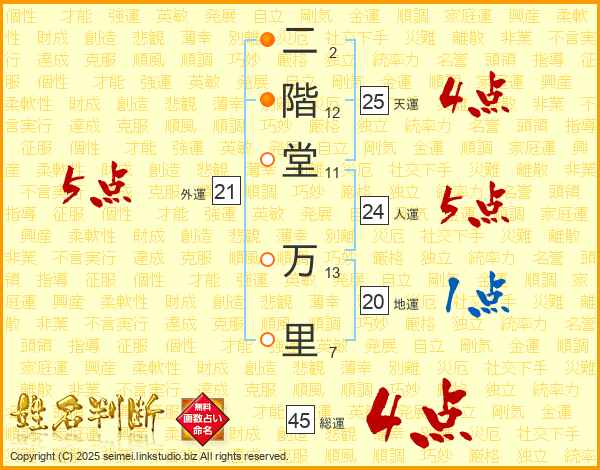 二(2画)階(12画)堂(11画) 万(13画)里(7画)