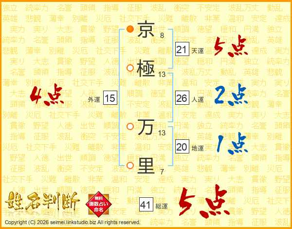 あなたの人生を表す1番重要な運勢です。生涯を通じて影響する総合運となり、主に50歳以降の晩年期に影響を及ぼします。苗字と名前の合計画数。