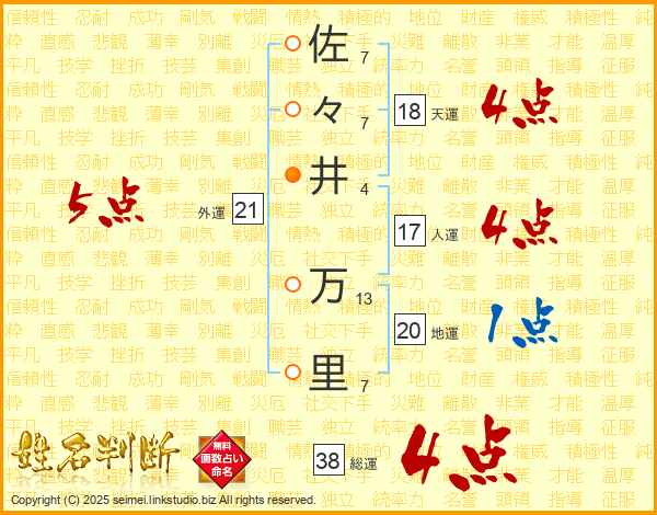 佐(7画)々(7画)井(4画) 万(13画)里(7画)