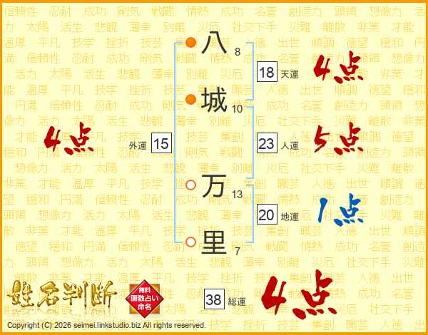 生活面を象徴する運勢です。外部から受ける影響力を表し、結婚運、家庭運や職場、環境への順応性を表します。総運から人運を引いた画数。姓や名が1文字の場合を除く。