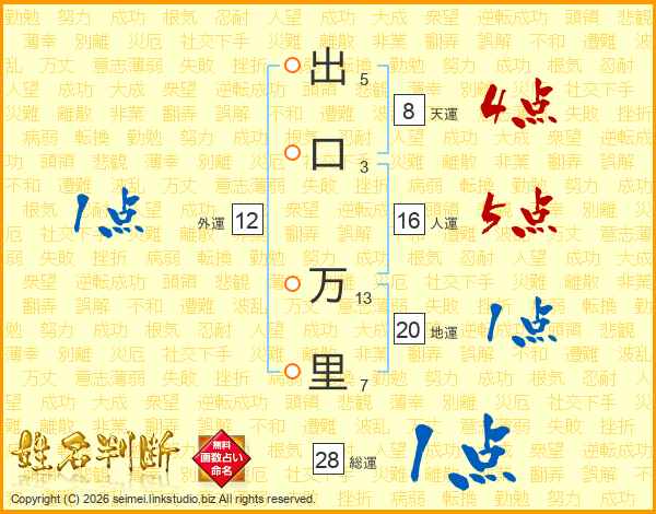 生活面を象徴する運勢です。外部から受ける影響力を表し、結婚運、家庭運や職場、環境への順応性を表します。総運から人運を引いた画数。姓や名が1文字の場合を除く。