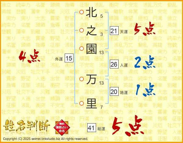 北(5画)之(3画)園(13画) 万(13画)里(7画)