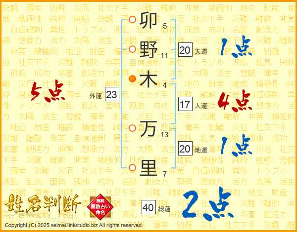 卯(5画)野(11画)木(4画) 万(13画)里(7画)