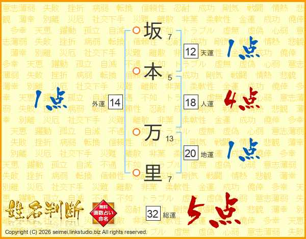 生活面を象徴する運勢です。外部から受ける影響力を表し、結婚運、家庭運や職場、環境への順応性を表します。総運から人運を引いた画数。姓や名が1文字の場合を除く。