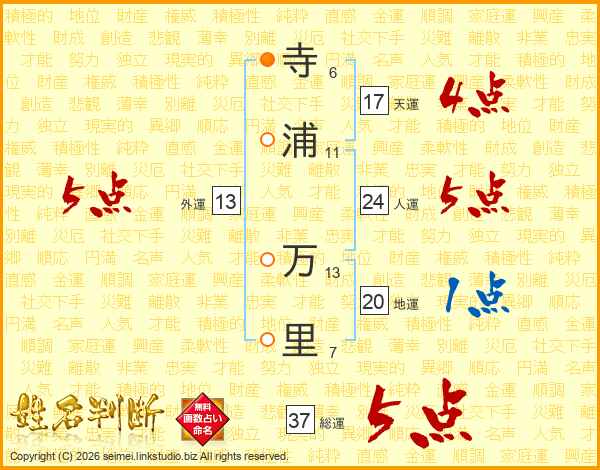 寺浦万里さんの総運は37画の5点!