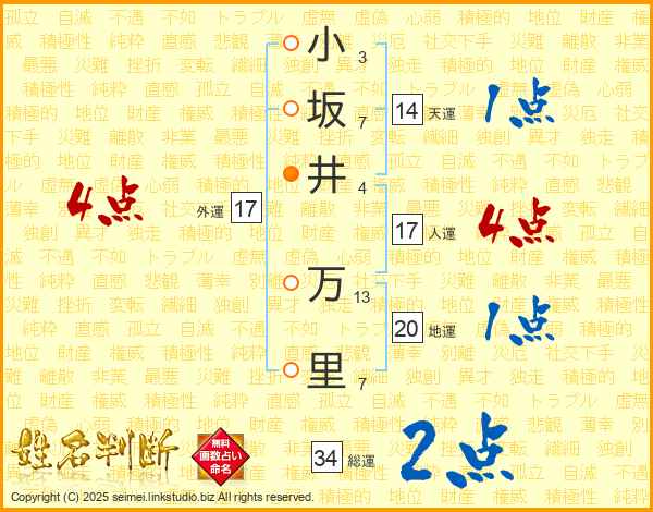小(3画)坂(7画)井(4画) 万(13画)里(7画)