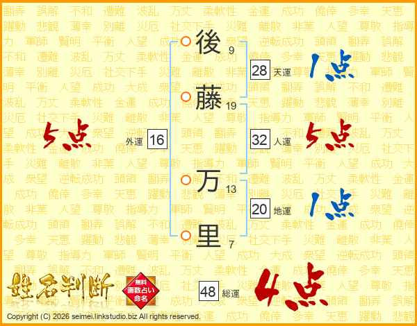 生活面を象徴する運勢です。外部から受ける影響力を表し、結婚運、家庭運や職場、環境への順応性を表します。総運から人運を引いた画数。姓や名が1文字の場合を除く。