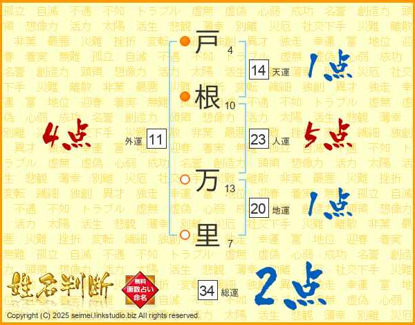戸(4画)根(10画) 万(13画)里(7画)