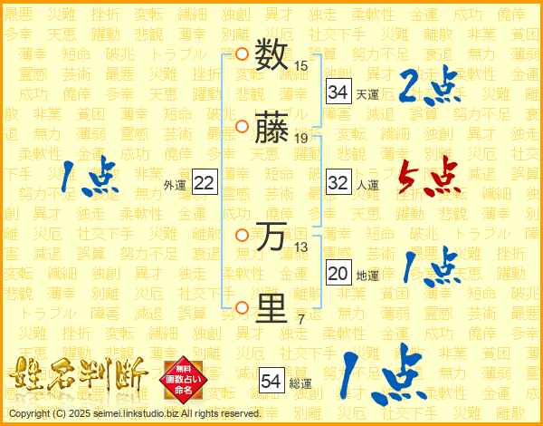 生活面を象徴する運勢です。外部から受ける影響力を表し、結婚運、家庭運や職場、環境への順応性を表します。総運から人運を引いた画数。姓や名が1文字の場合を除く。