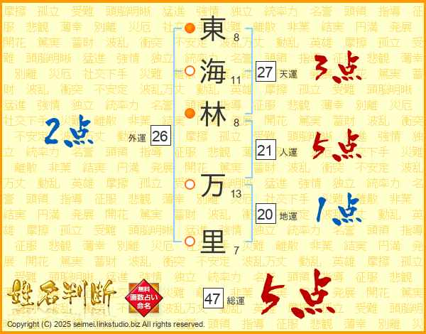 東(8画)海(11画)林(8画) 万(13画)里(7画)