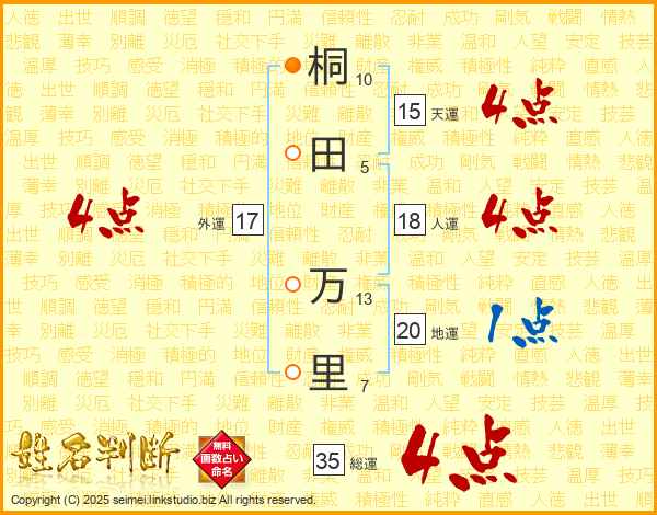 生活面を象徴する運勢です。外部から受ける影響力を表し、結婚運、家庭運や職場、環境への順応性を表します。総運から人運を引いた画数。姓や名が1文字の場合を除く。