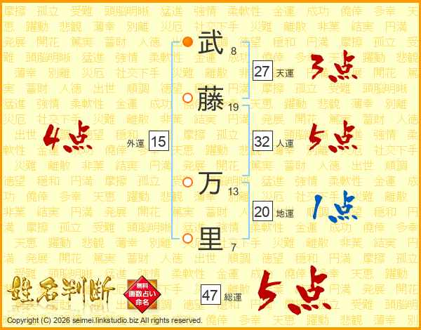 武(8画)藤(19画) 万(13画)里(7画)