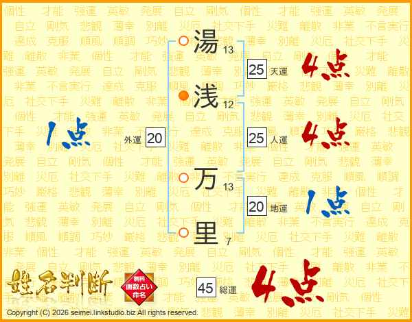 生活面を象徴する運勢です。外部から受ける影響力を表し、結婚運、家庭運や職場、環境への順応性を表します。総運から人運を引いた画数。姓や名が1文字の場合を除く。