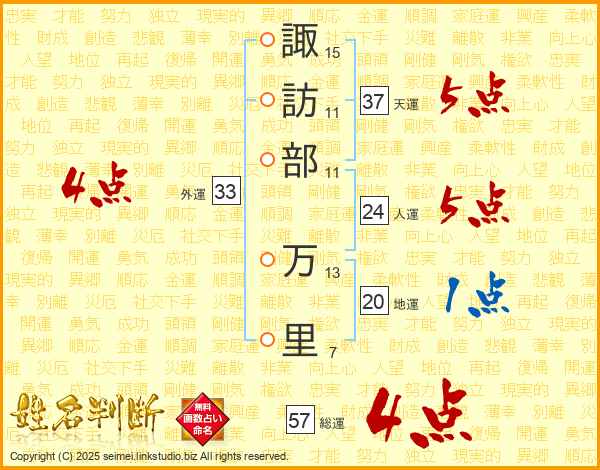 諏(15画)訪(11画)部(11画) 万(13画)里(7画)